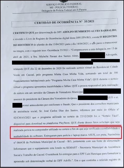 “Que diante desses fatos, solicitam que seja realizada perícia no computador utilizado no sorteio a fim de que seja verificada a confiabilidade e auditabilidade do software”, diz a certidão de ocorrência nº 35/2021 lavrado na PF.