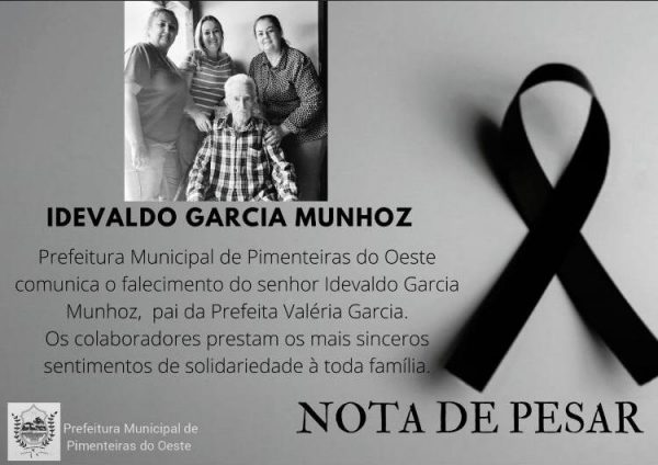 Idevaldo Garcia Munhoz, de 79 anos, pai da prefeita de Pimenteiras do Oeste, Valéria Aparecida Marcelino Garcia, morreu nesta segunda-feira, 6, em São Paulo (SP), vítima de Câncer.