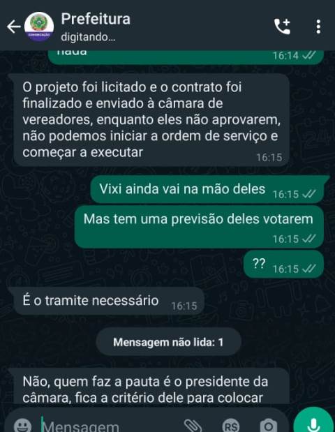 No print obtido pelo Extra de Rondônia, o representante da prefeitura disse que a responsabilidade das pautas no Legislativo é de Macedo (leia o diálogo no final da matéria)
