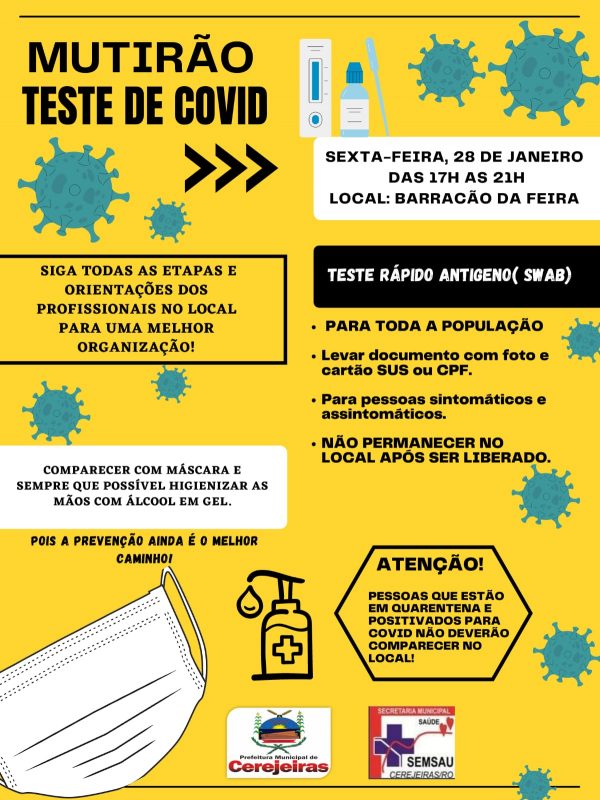 Considerando o aumento do número de casos de positivados em Cerejeiras, conforme mostra o boletim epidemiológico do dia 26 de janeiro, bem como a superlotação da demanda na ala covid-19, o prefeito em exercício José Carlos Valendorff, assinou novo decreto, além do mutirão para realizar a testagem rápida da população.