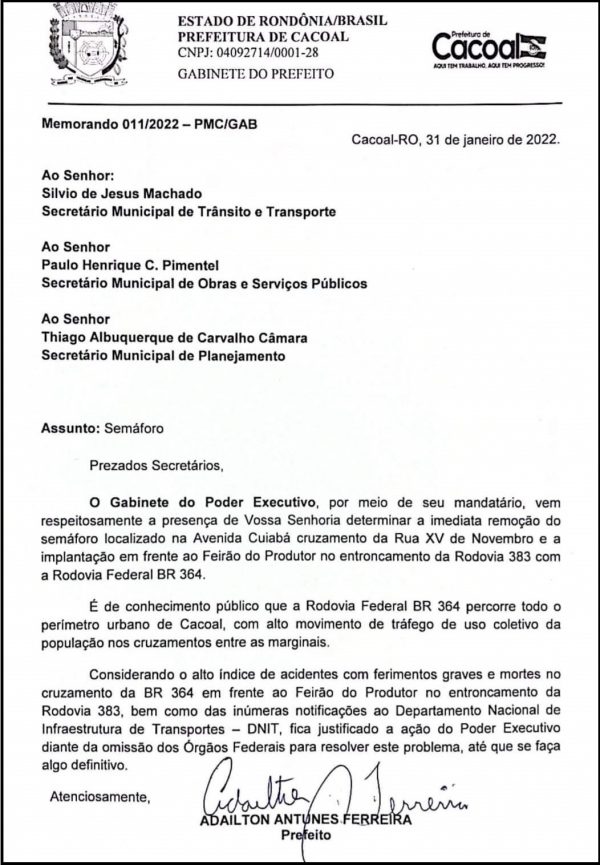 Nesta segunda-feira, 31, o prefeito Adailton Fúria (PSD) enviou ofícios a três secretários municipais determinando a remoção do semáforo da Avenida Cuiabá, para que o mesmo seja instalado, de forma emergencial, em frente ao Feirão do Produtor, no entroncamento da rodovia 383 com a rodovia federal 364, considerado pelo mandatário como uma das travessias mais perigosas de Rondônia.