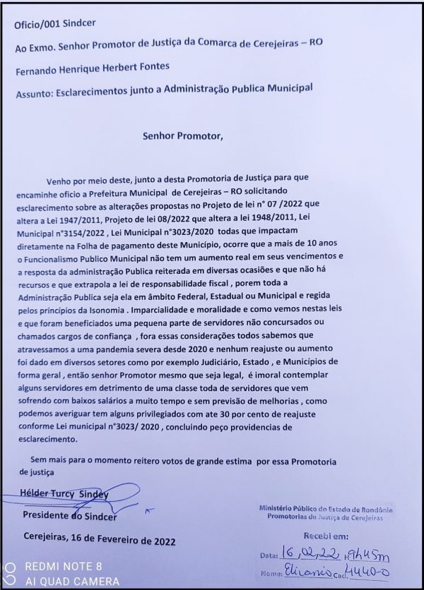 Em ofício protocolado na manhã desta quarta-feira, 16, no Ministério Público (MP), o sindicato dos Servidores Públicos Municipais de Cerejeiras (Sindcer) solicitou intervenção do órgão ministerial para que a prefeitura explica supostos privilégios a servidores mais próximo dos gestores públicos.