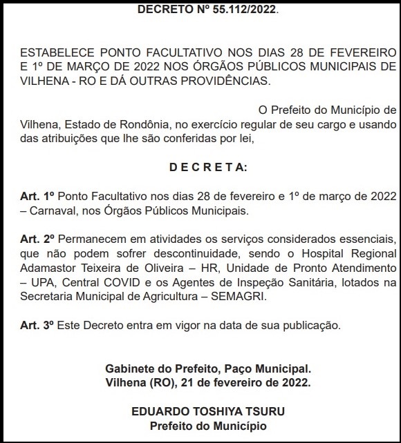 A Prefeitura de Vilhena estabeleceu dois dias de ponto facultativo durante o Carnaval de 2022.
