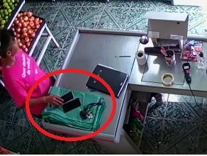 As imagens mostram a mulher olhando para os lados e observando se não há ninguém, vai até a porta, volta e observa novamente, em seguida ela se aproxima do balcão, pega os aparelhos, coloca debaixo da roupa e sai.