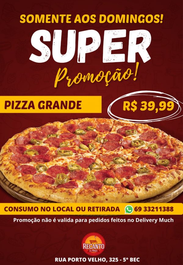 Com isso, a partir deste domingo, 27, o restaurante Recanto da Praça, lança a promoção aos domingos, ou seja, você vai saborear uma deliciosa pizza grande por apenas R$ 39,99.