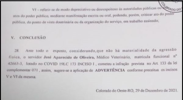Em entrevista ao Extra de Rondônia, José Oliveira informou que foi acusado pde suposta agressão a um funcionário público. Ele disse que uma comissão foi criada para analisar o caso e que a mesma decidiu por uma advertência, já que não haviam provas contundentes da acusação (leia abaixo).