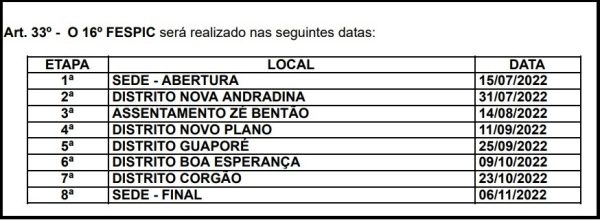 Locais e datas das etapas do Fespic / Foto: Extra de Rondônia