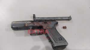 Um projetil ficou alojado num simulacro de pistola que estava na cintura da vítima.