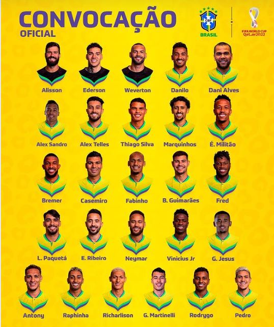 A seleção que defenderá o Brasil na Copa do Mundo do Catar, a partir do próximo dia 20, está convocada.