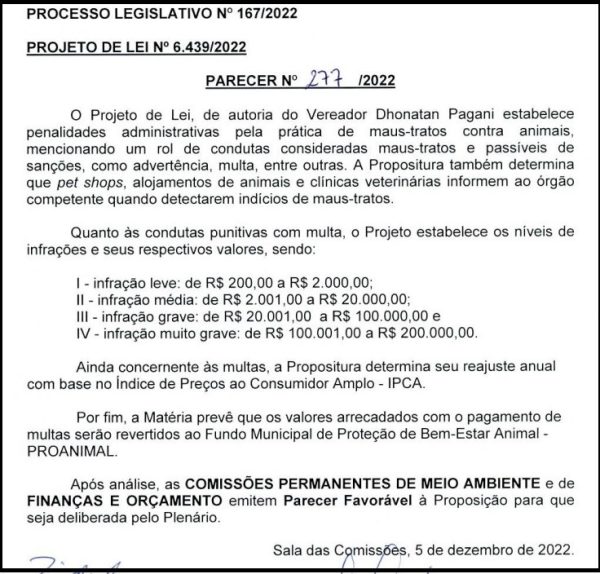 Entre os vários projetos de leis aprovados na sessão ordinária da última terça-feira, 6, na Câmara de Vilhena, está o nº 6.439/2022, que estabelece penalidades administrativas pela prática de maus-tratos contra animais no município, com multa de até R$ 200 mil.