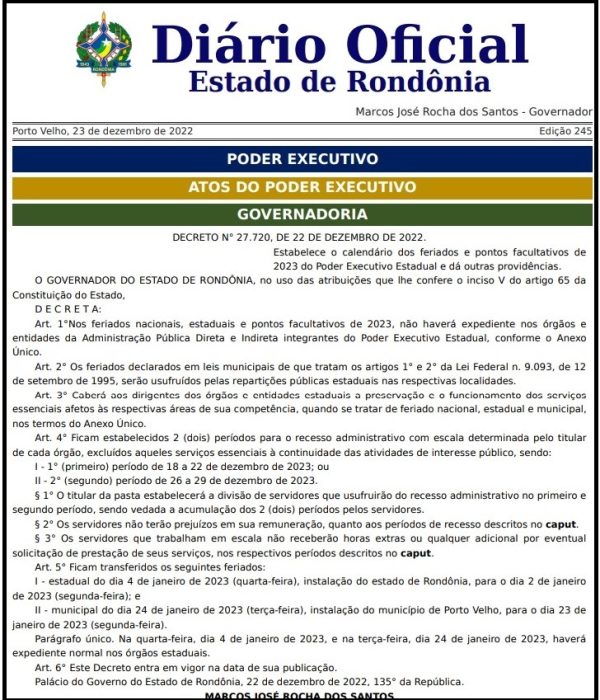 O Governo de Rondônia publicou nesta sexta-feira (23), o decreto nº 27.720, que estabelece o calendário dos feriados e pontos facultativos de 2023 do Poder Executivo estadual.