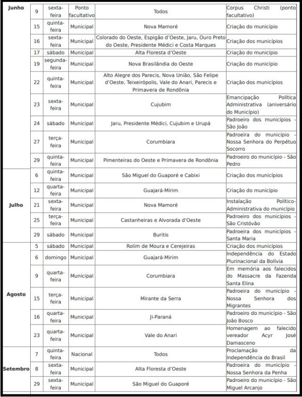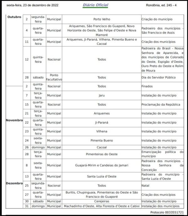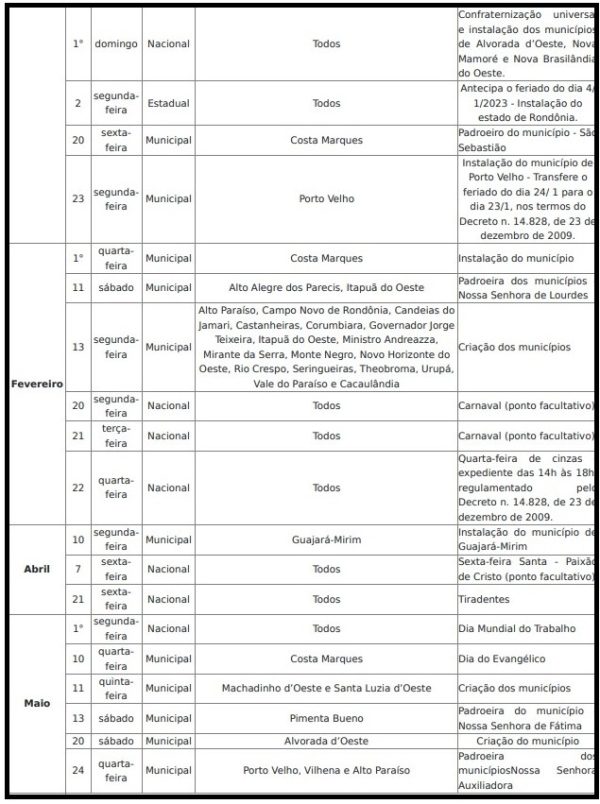 á o feriado de 24 de janeiro, dia de comemoração da instalação do município de Porto Velho será adiantado para o dia 23 de janeiro, também numa segunda-feira. Na quarta-feira, dia 4 de janeiro de 2023, e na terça-feira, dia 24 de janeiro de 2023 haverá expediente normal nos órgãos estaduais.