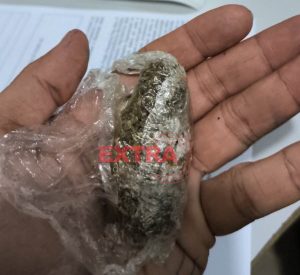 Durante revista pessoal foi localizada no bolso de sua calça uma porção de substancia aparentando ser maconha, pesando aproximadamente 8 gramas, no qual o rapaz relatou que adquiriu para seu consumo.