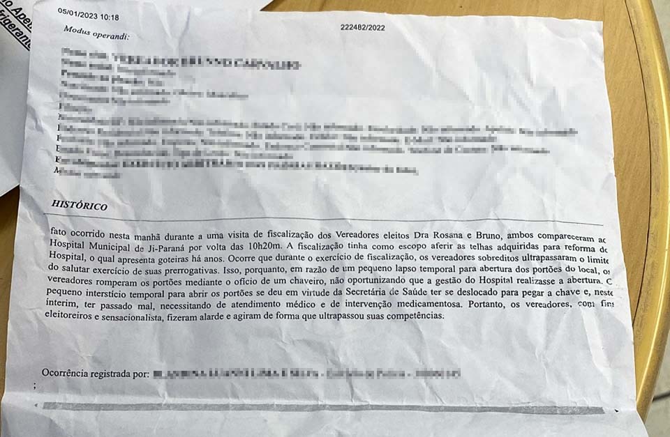 O enfermeiro Diogo de Souza Oliveira, diretor-geral do Hospital Municipal de Ji-Paraná, registrou Boletim de Ocorrência (BO) contra os vereadores Brunno Carvalho, do Solidariedade, e Rosana Pereira Lima, a Doutora Rosana Veterinária, do DEM.