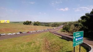 Por volta das 11 horas da manhã, o comboio que levava o ex-presidente Bolsonaro e o governador de São Paulo, Tarcísio Freitas, usou o acostamento da rodovia Prefeito Antônio Duarte Nogueira para cortar o trânsito e chegar na feira.