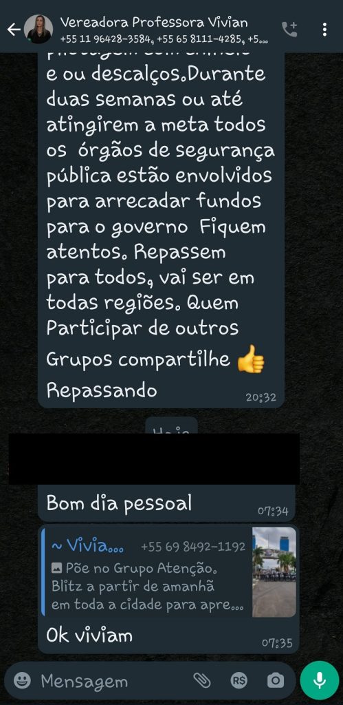 O denunciante disse que a parlamentar cometeu um crime ao compartilhar, em 7 de setembro, o alerta de blitz no seu grupo de WhatsApp identificado como “Vereadora professora Vivian”.
