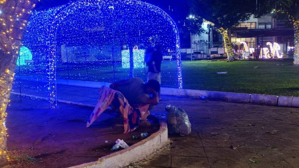 Nesta imagem, próximo ao túnel de luzes é possível ver uma desses moradores usando o banco como cama. Quem vem conhecer a decoração, seja de Vilhena ou de outro município vizinho, se depara com a cena que é característica de uma cidade grande.