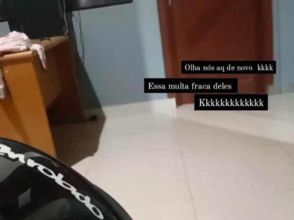 Na delegacia, o infrator escreveu em sua rede social: “Olha nós aqui de novo kkkkk, essa multa fraca deles kkkk”.
