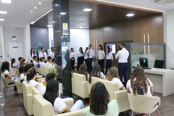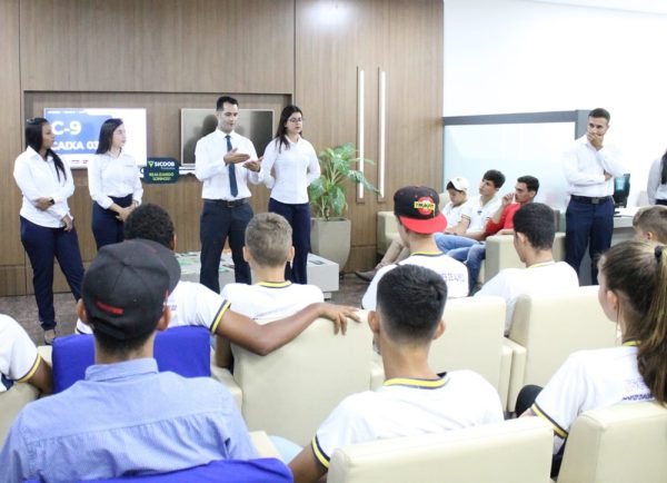 EDUCAÇÃO FINANCEIRA E COOPERATIVISMO    Estudantes da rede pública de ensino da Escola Clodoaldo Nunes de Almeida de Cacoal/RO, entre 14 e 17 anos, visitaram na última terça-feira, a agência da SICOOB FRONTEIRAS e foram recepcionados pelo gerente geral Edivaldo Rodrigues de Almeida e colaboradores. Edvaldo contou um pouco da história da cooperativa financeira, desde seu surgimento em 1999, criada por iniciativa de 59 empreendedores locais, até os dias atuais, onde o SICOOB FRONTEIRAS já superou todas as expectativas iniciais e soma mais de 20 mil cooperados em três estados, Rondônia, Mato Grosso e Mato Grosso do Sul. Os alunos puderam saber um pouco das vantagens de uma cooperativa financeira, e tiraram dúvidas sobre alguns serviços e produtos, e ainda, a importância da educação financeira.