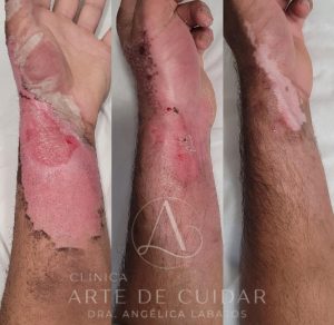 A fisioterapeuta enfatiza que a intervenção da fisioterapia é crucial desde o primeiro momento, visando maximizar a funcionalidade do tecido queimado e proporcionar uma evolução positiva para o paciente.(Como na foto ao lado).