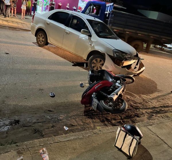 Um acidente envolvendo um carro e uma motoneta Biz ocorreu na noite desta segunda-feira, 15, no bairro Jardim Primavera, em Vilhena, deixando um jovem de 23 anos com fratura exposta na perna direita.