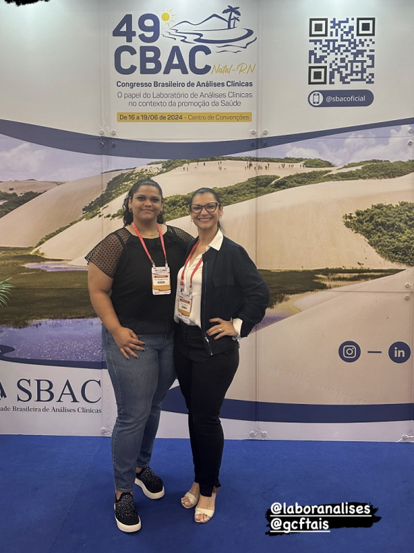 LABORANÁLISES NO 49º CBAC em NATAL/RN    A farmacêutica e bioqúmica Kelly Cristina especialista em citologia e hematologia clínica, sócia proprietária do renomado LABORANÁLISES em Cacoal/RO, participou no período de 16 a 19 último, em Natal/RN, do 49ª CBAC – Congresso Brasileiro de Análises Clínicas evento que reuniu profissionais de diagnóstico laboratorial de todo o Brasil e da América Latina, no Centro de Convenções. Na foto Kelly Cristina com Tais Fernandes Felix que cursa último ano de biomedicina.