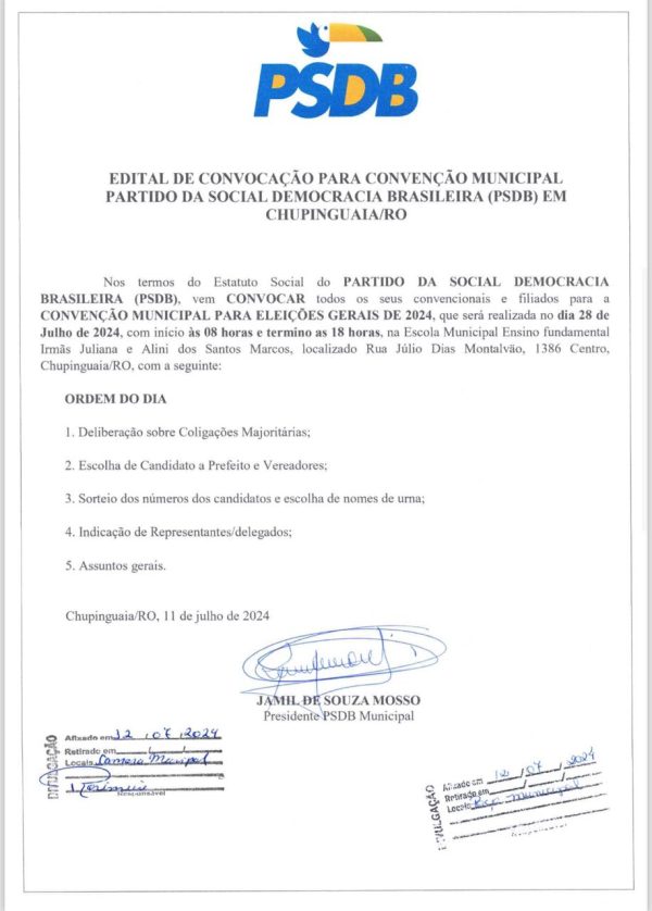 EDITAL DE CONVOCAÇÃO PARA CONVENÇÃO MUNICIPAL PARTIDO PSDB EM CHUPINGUAIA Por Carlos Franco - 13/07/2024 - 12:47 Compartilhar Facebook Twitter WhatsApp [pro_ad_display_adzone id="258130"][pro_ad_display_adzone id="320325"] ARTIGOS RELACIONADOSMais notícias EDITAL / AVISO DE LICITAÇÃO – IFRO CAMPUS COLORADO DO OESTE EDITL DE CONVOCAÇÃO EDITAL – AVISO DE LICITAÇÃO IFRO / CAMPUS COLORADO DO OESTE DEIXE UMA RESPOSTA Please enter your comment! Digite seu nome aqui Você digitou um e-mail inválido! Digite seu e-mail aqui