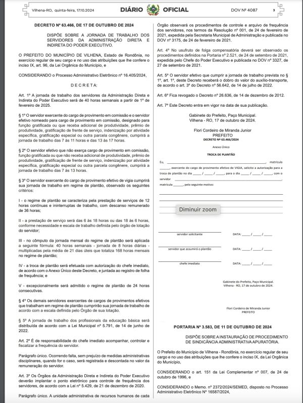 Nesta quinta-feira, 17, através do Decreto 63.466, publicado no Diário Oficial de Vilhena (DOV), o mandatário municipal formalizou a jornada de trabalho dos servidores da administração direta e indireta do Poder Executivo que será de 40 horas semanais a partir de 1º de fevereiro de 2025.