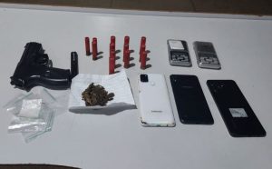 Diante do flagrante, uma busca foi feita no quarto do suspeito. Sob a cama, foi localizado certa quantia de maconha, duas balanças de precisão, diversas embalagens plásticas do tipo zip lock e dois smartphones (um da marca Realme e outro Samsung, ambos no modo avião). Na prateleira, havia munições de arma de fogo: três de calibre .36 e dez de calibre .32. Além disso, na gaveta de uma cômoda, foi encontrado um simulacro de arma de fogo, do tipo pistola, de cor preta, marca Rossi.