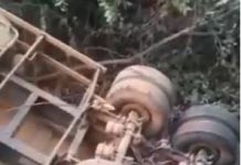Uma caçamba carregada de calcário tombou sobre a ponte do Taboca na noite da última quarta-feira 09, na divisa entre Chupinguaia e Parecis.