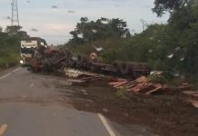 VÍDEO: carreta carregada com madeira tomba próximo ao Piracolino em Vilhena
